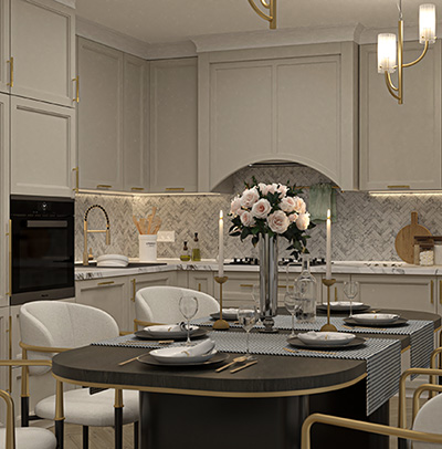 Fiecare detaliu – de la profilele decorative subtile, la paleta cromatică în tonuri calde, accentele aurii mate și finisajele atent selecționate – contribuie la o atmosferă senină și elegantă, în care confortul capătă o dimensiune estetică.