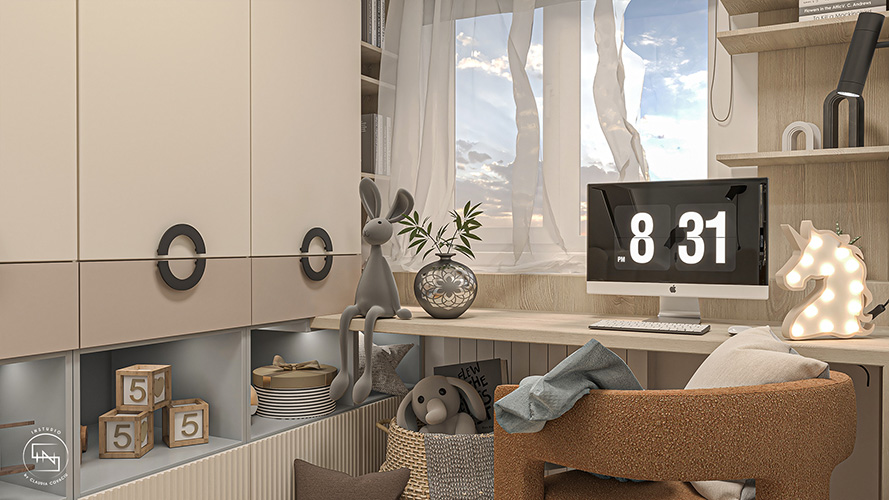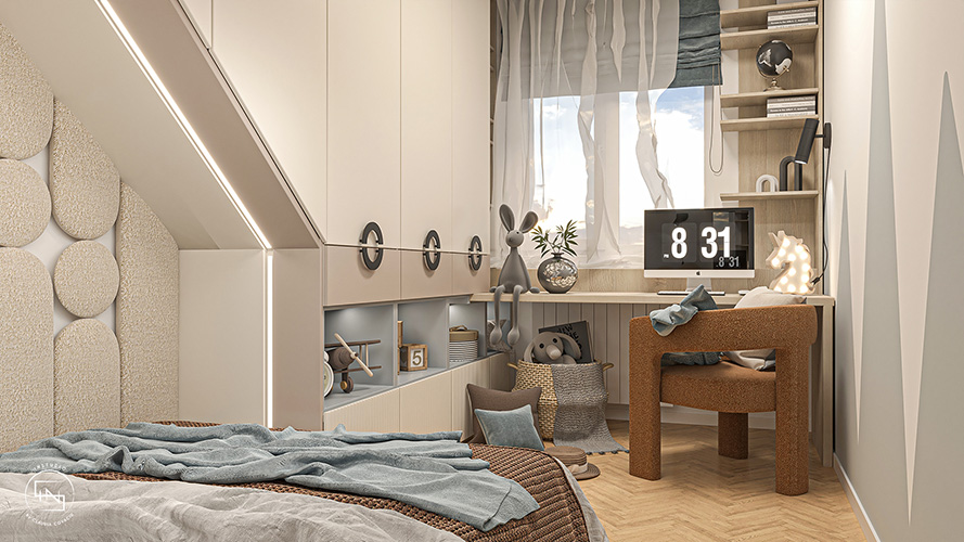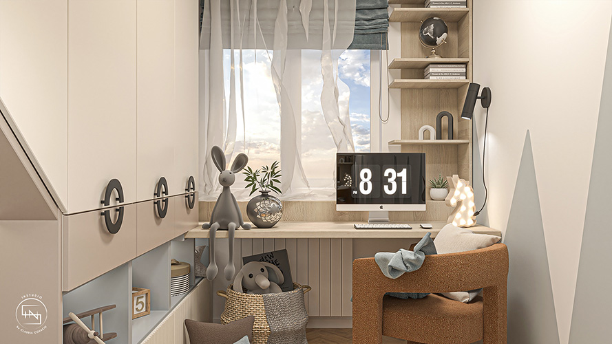 Zona de studiu beneficiază de lumina naturală, iar mobilierul personalizat se conturează perfect în arhitectura camerei. Contrastul dintre volumele închise și cele deschise adaugă ritm și profunzime.