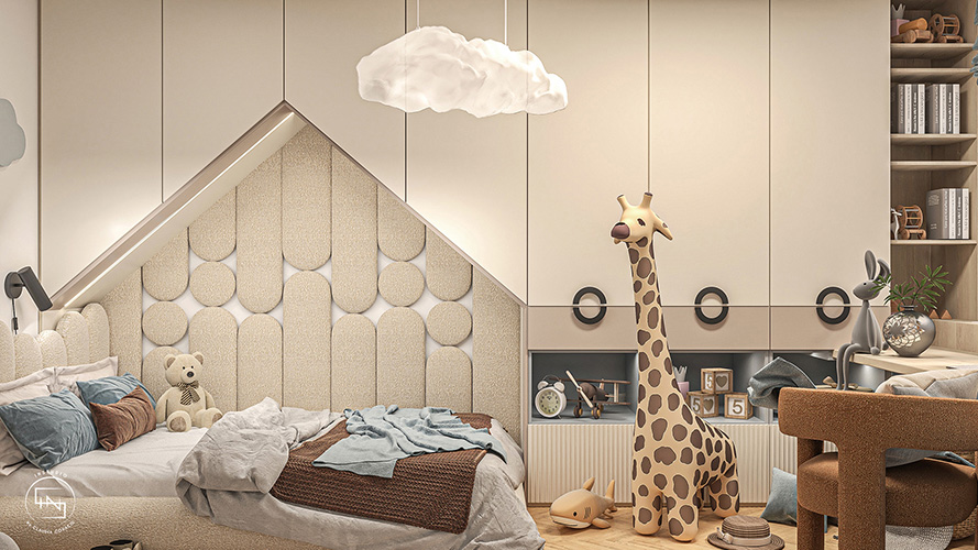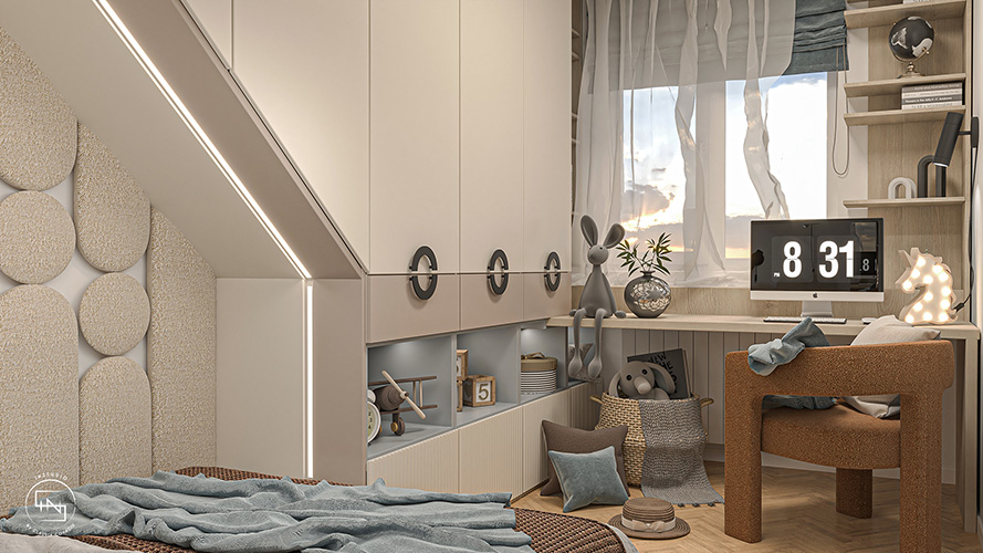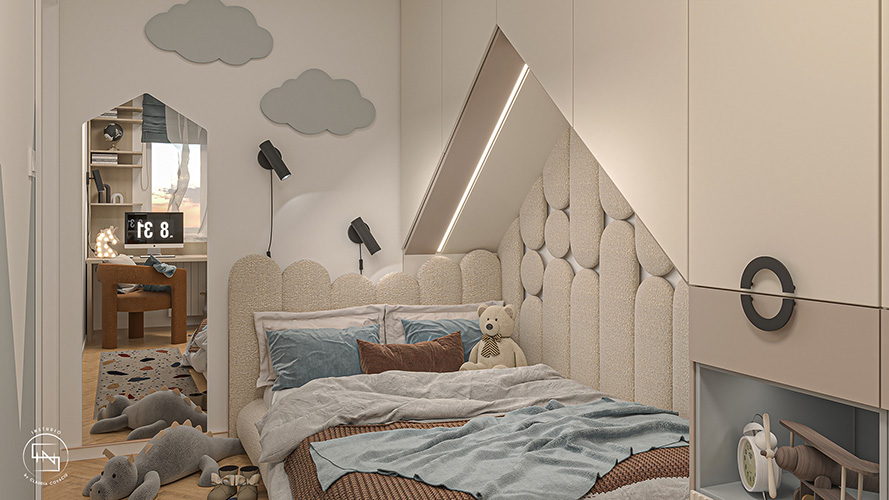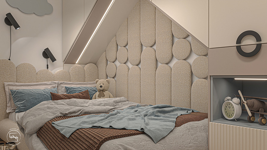 Zona de odihnă este punctul central al camerei, evidențiată printr-un perete tapițat, integrat într-o volumetrie care sugerează silueta unei căsuțe.